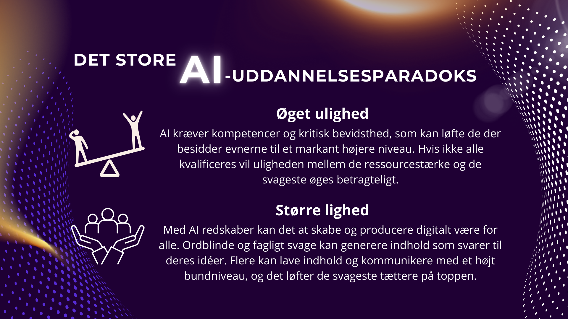 Hvis ikke skolen giver alle elever de nødvendige kompetencer til at bruge AI kritisk og konstruktivt, vil det øge uligheden i samfundet. De mest ressourcestærke skal nok lære at bruge AI – men hvad med resten?